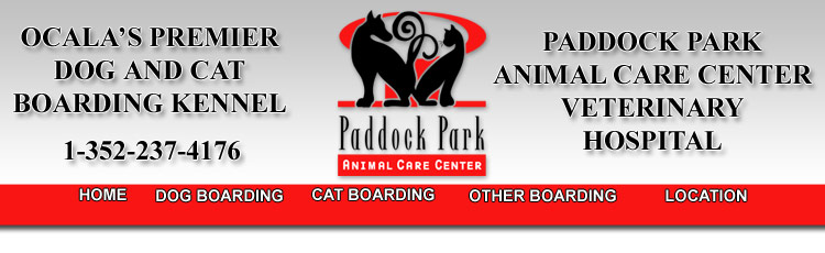 are committed to promoting responsible pet ownership, preventative health care and health-related educational opportunities for our clients. Our Ocala Veterinary Hospital strives to offer excellence in pet care to Ocala, Dunnellon, Belleview, Micanopy, Silver Springs, Reddick, FL and surrounding areas. Please take a moment to contact us today, to learn more about our vet clinic and to find our more information about how Paddock Park Animal Care Center can serve the needs of you and your cherished pet. We now how much you love your dogs and cats. We are also pet owners. Ocala Dog Cat Boarding Kennels When boarding your dog or cat at a kennel there are a few things you need to know. Will they treat my pet with love and care while at the kennel and I am away? Yes we will. The care of your and happiness of your dog, cat or other animal is are only concern. We are also pet owners. Are the boarding kennels clean? Yes. Very clean and kept that way. A clean pet is a happy pet and our cleaning staff ensures that the kennels are kept neat and tidy. For more info about our Ocala boarding kennels for dogs, cats and other critters give us a call at 1-352-237-4176 Paddock Park Animal Care Center 3931 SW 42nd Street Ocala, Fl 34474 1-352-237-4176 |
